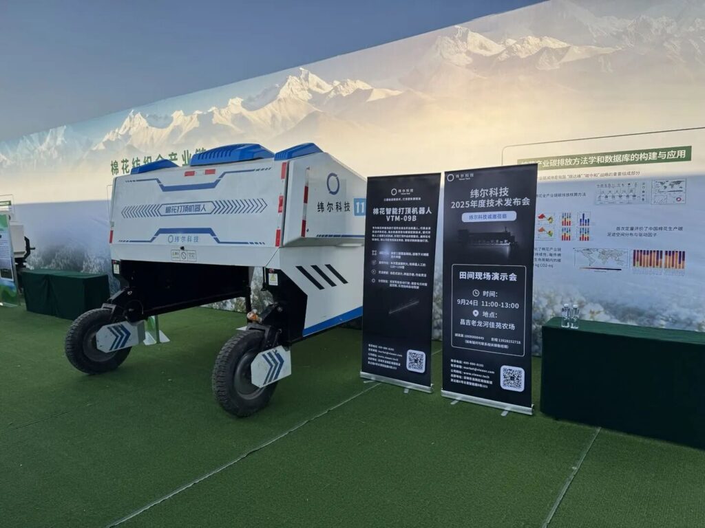 在“数智强农”科技成果展区,纬尔科技携全球首款棉花智能打顶机器人重磅亮相。该设备集成双目视觉三维重建、AI规划算法与精准作业控制技术,能够模拟人工手法进行高精度打顶,并支持全天候作业,为解决棉花管理中的人工紧缺、效率低等难题提供了智能化方案。