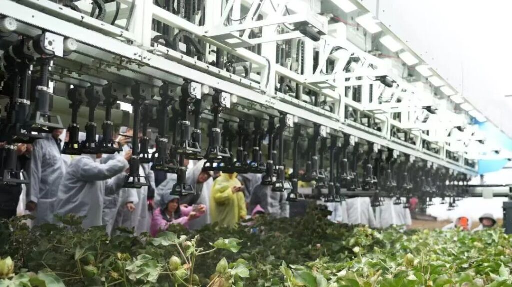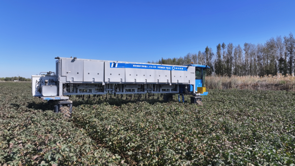 该机器人搭载先进传感器和机器视觉系统,能够精准识别棉花顶芽,模仿人工打顶操作,其配备了108个机械臂,搭配水平跨度6.8米的灵活底盘,1.7米的离地间隙可精准适配新疆“一膜六行”的种植模式。单台设备每天可作业400至600亩,效率是传统人工打顶的120倍以上,实现高效、精准的作业;借助农艺大模型与实时环境感知技术,它还能动态调整打顶策略,即便在夜间也能持续作业,有效缓解了农忙期劳动力短缺的问题。
