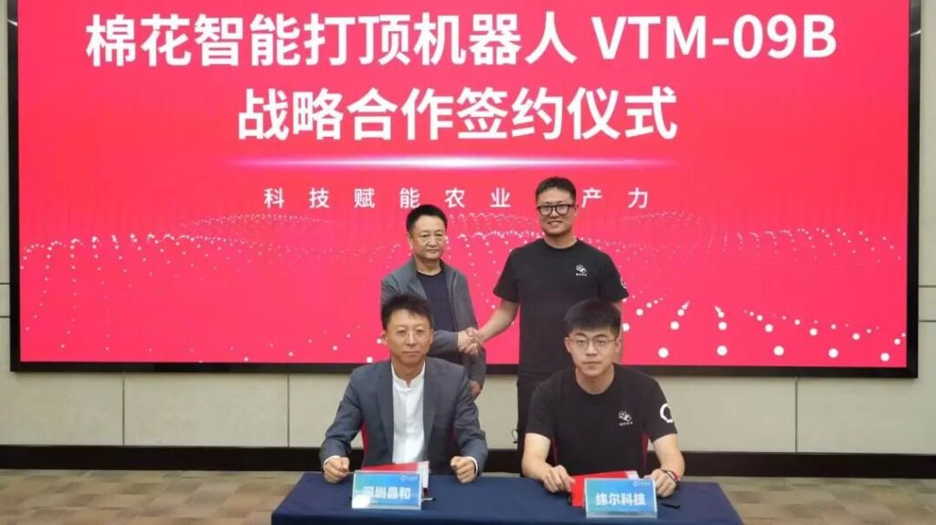 此次签约仪式在纬尔科技2025年度技术发布会上举行,深圳晶和能源科技发展有限公司将于2026年采购50台纬尔科技自主研发的棉花智能打顶机器人,用于市场推广与作业服务。